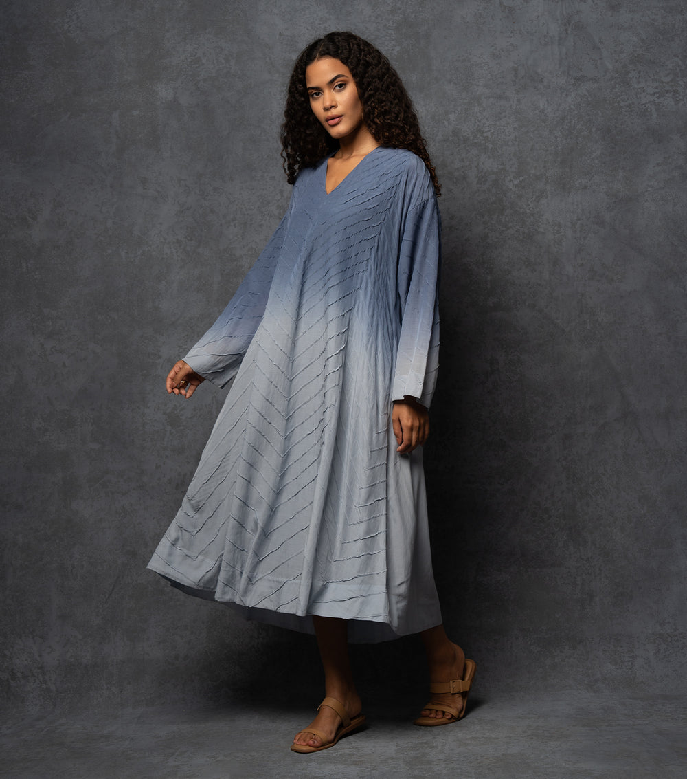 Ombre Grace Textured Cotton Dress with Mock Gathered Neckline