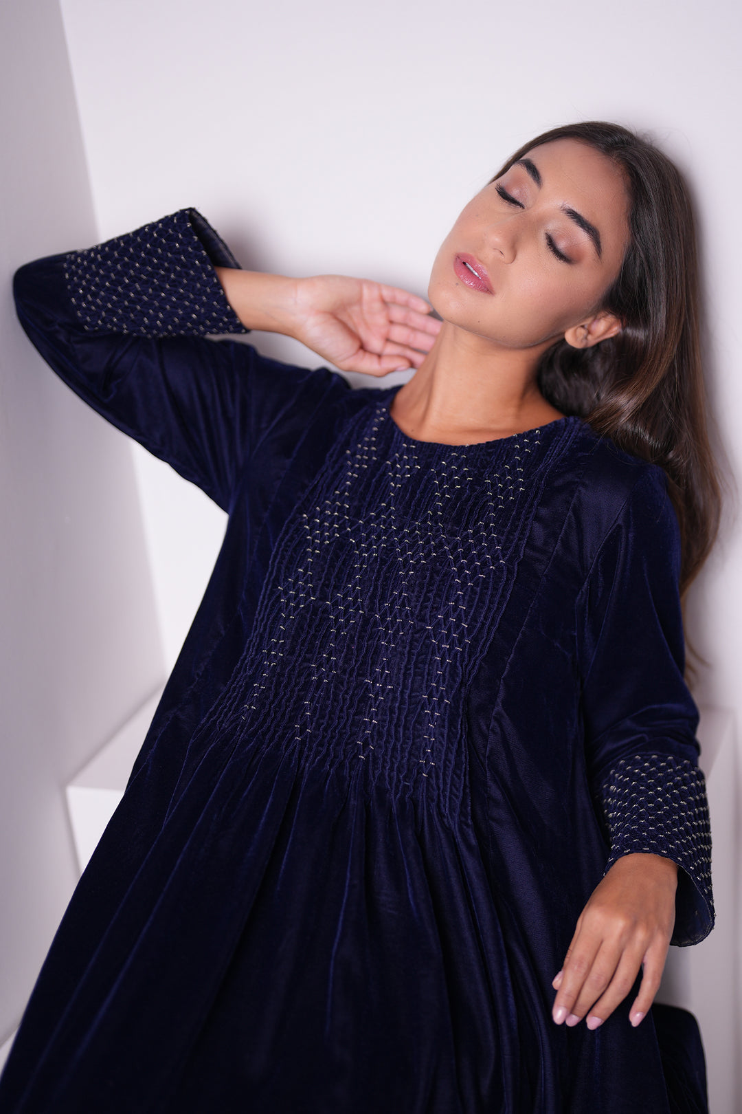 Layered Indigo Blue Tussar Silk Dress with Oversized Tunic
