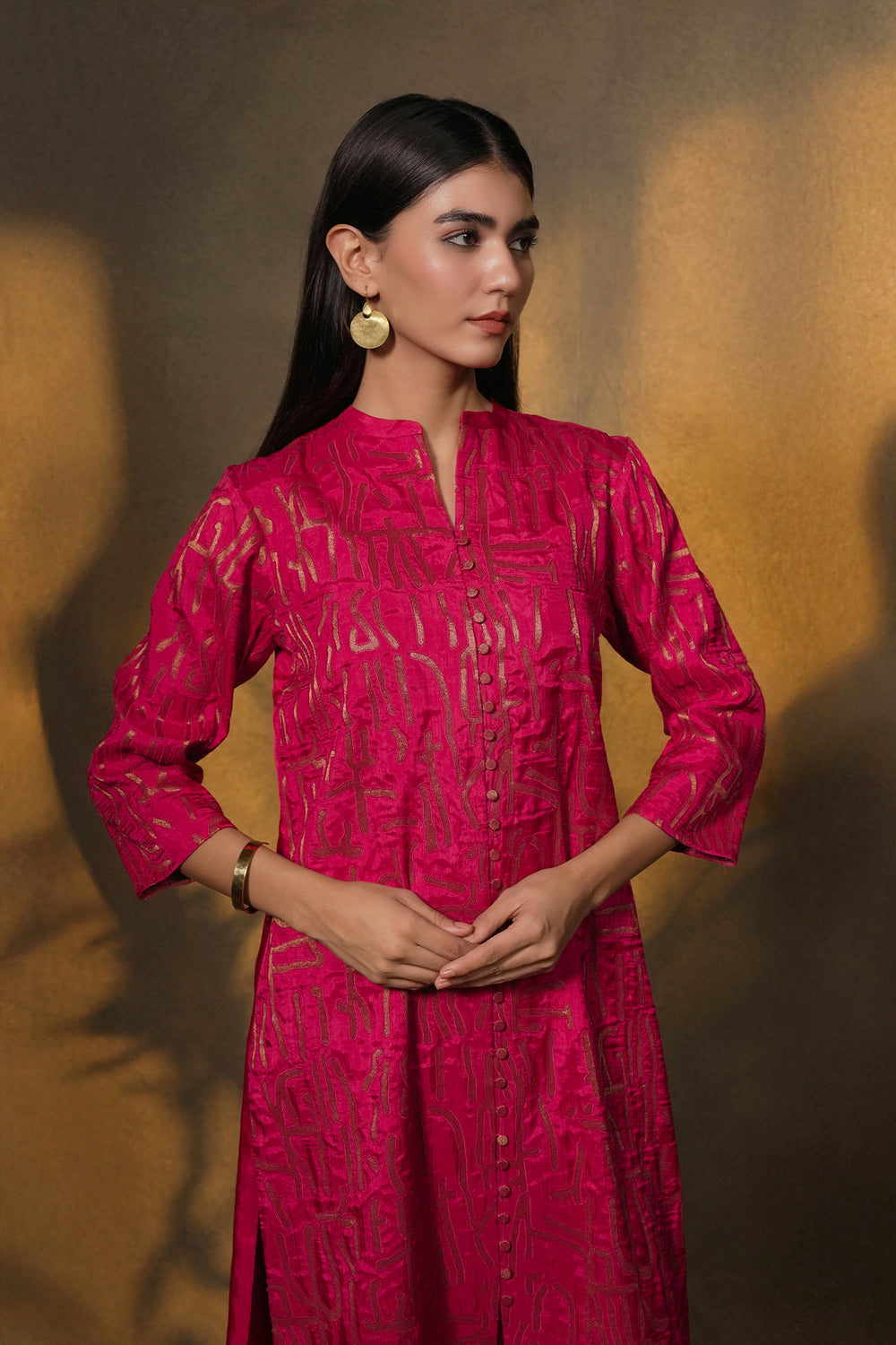 Hot Pink Patch Work Embroidered Silk Kurta with Pants