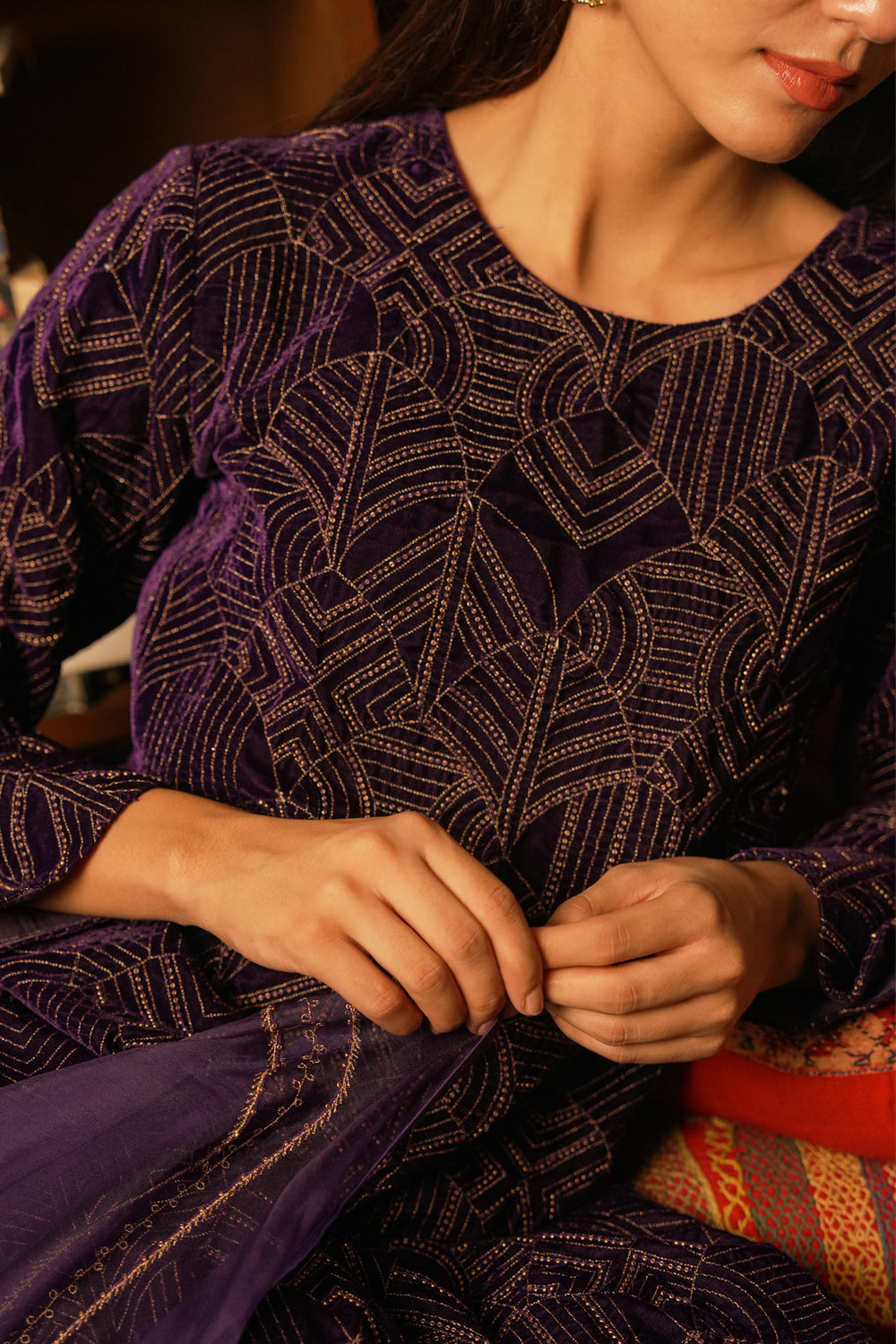 Purple Hand Embroidered Velvet Kurta with Pants and Organza Dupatta