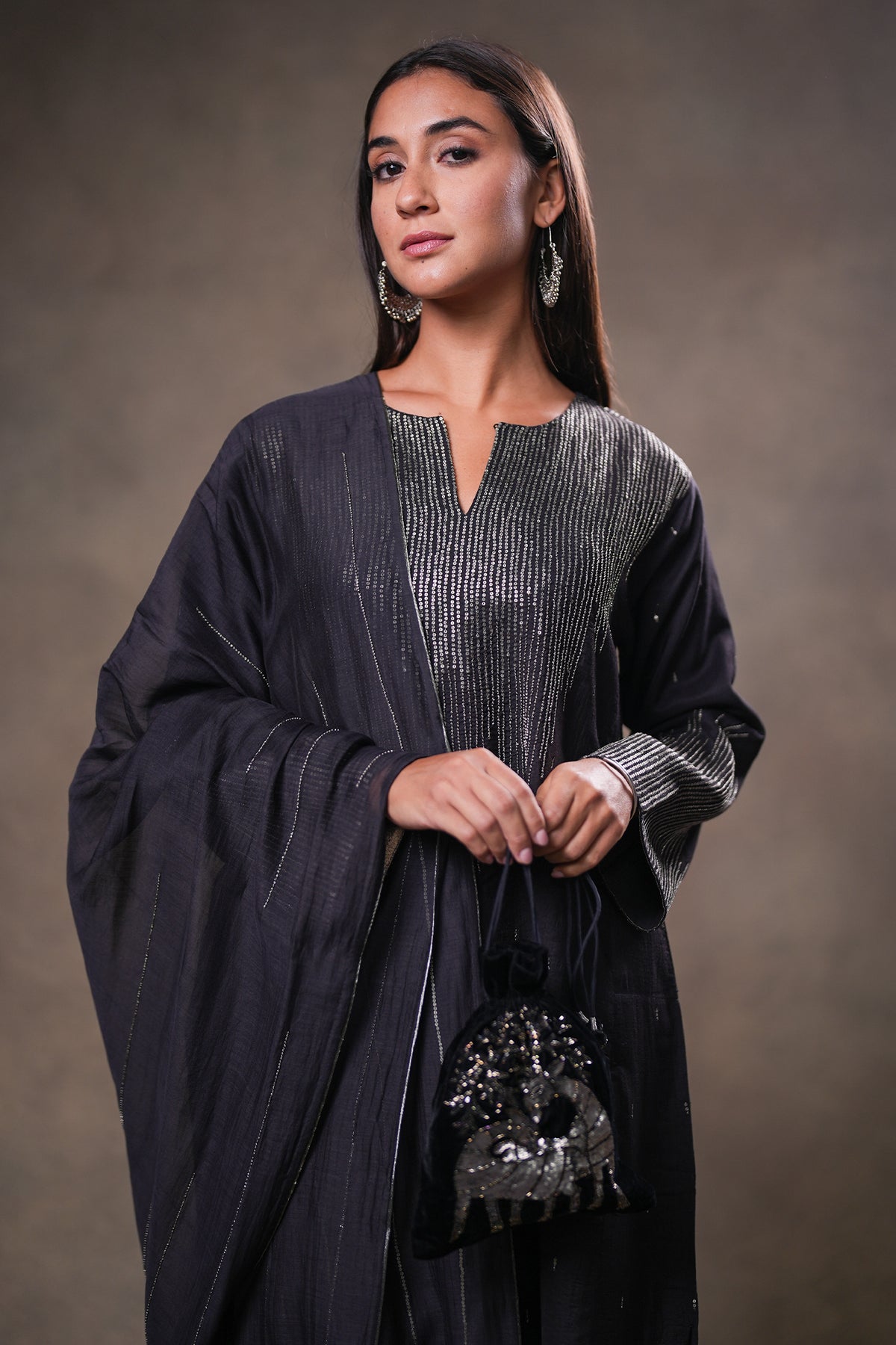 Black Hand Embroidered Silk Kurta with Pants and Dupatta