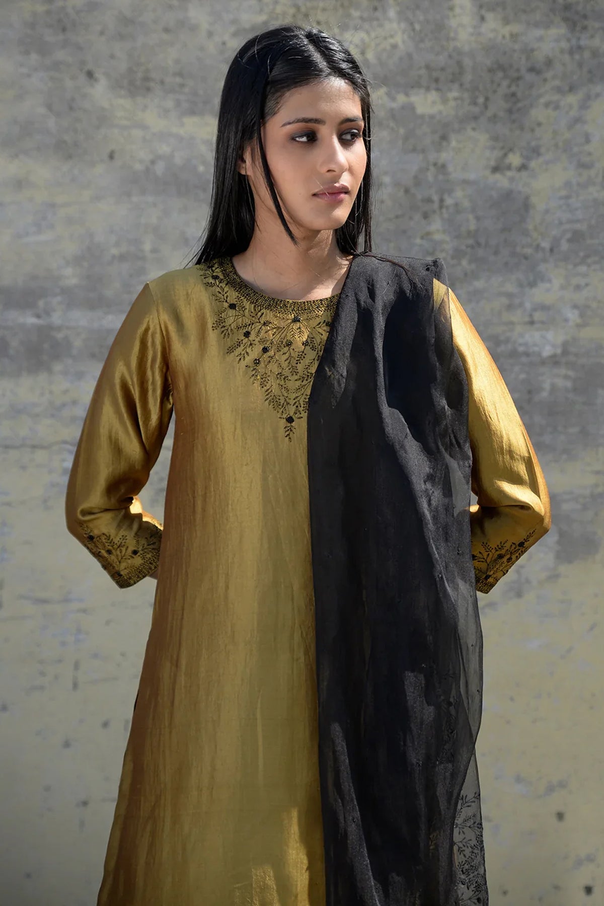 • Featuring a gold dupion silk kurta, meticulously adorned with delicate floral embroidery along the neckline and sleeves. This kurta boasts a sophisticated round neckline. Paired elegantly with matching gold pants, featuring side elasticated waist and front zip & hook closure. Complementing this ensemble is a black organza delicately embroidered dupatta.