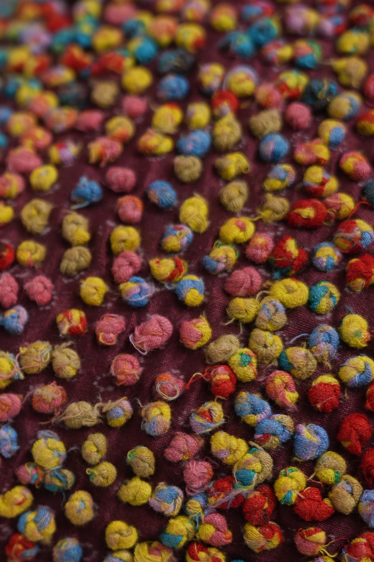 • Cushion cover with hand-done french knots with cotton fabric in varying colors on the front creating a 3D texture
