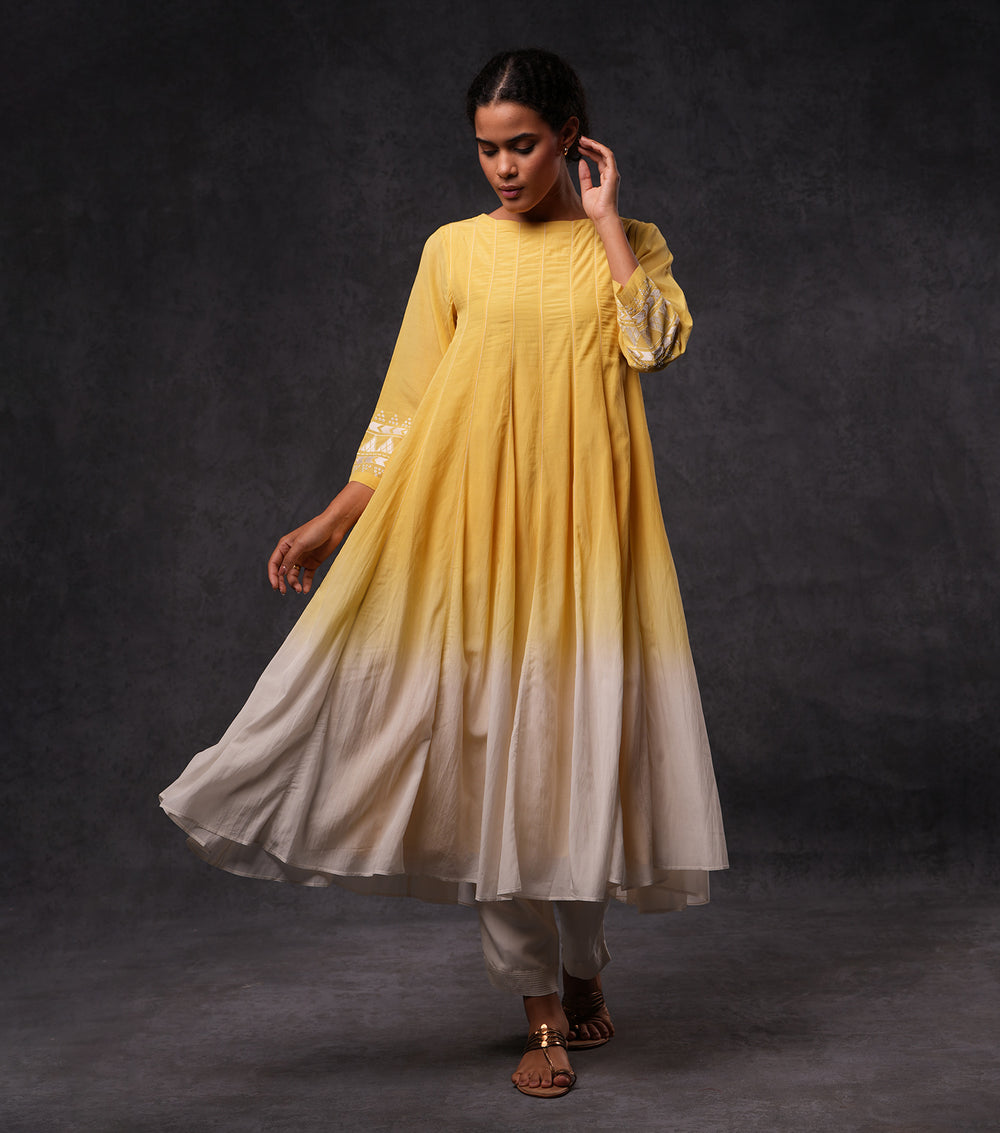 Yellow & Ivory Embroidered Ombre Cotton Kurta Set