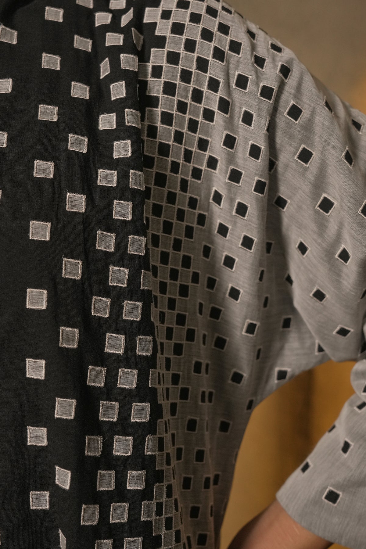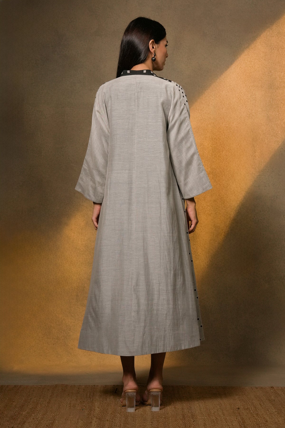 Elegant and thoughtfully crafted, the Natural Patch Work Embroidered Chanderi Cape is made in sheer Chanderi, layered over a comfortable cotton slip. The design features a striking interplay of natural and black tones, brought to life through delicate patchwork embroidery arranged in a geometric rhythm. Its open-front silhouette and fluid fall create effortless movement, while the structured inner adds balance and ease. Refined yet contemporary, this cape set transitions seamlessly from day to evening, offering a modern expression of artisanal detailing and understated sophistication.