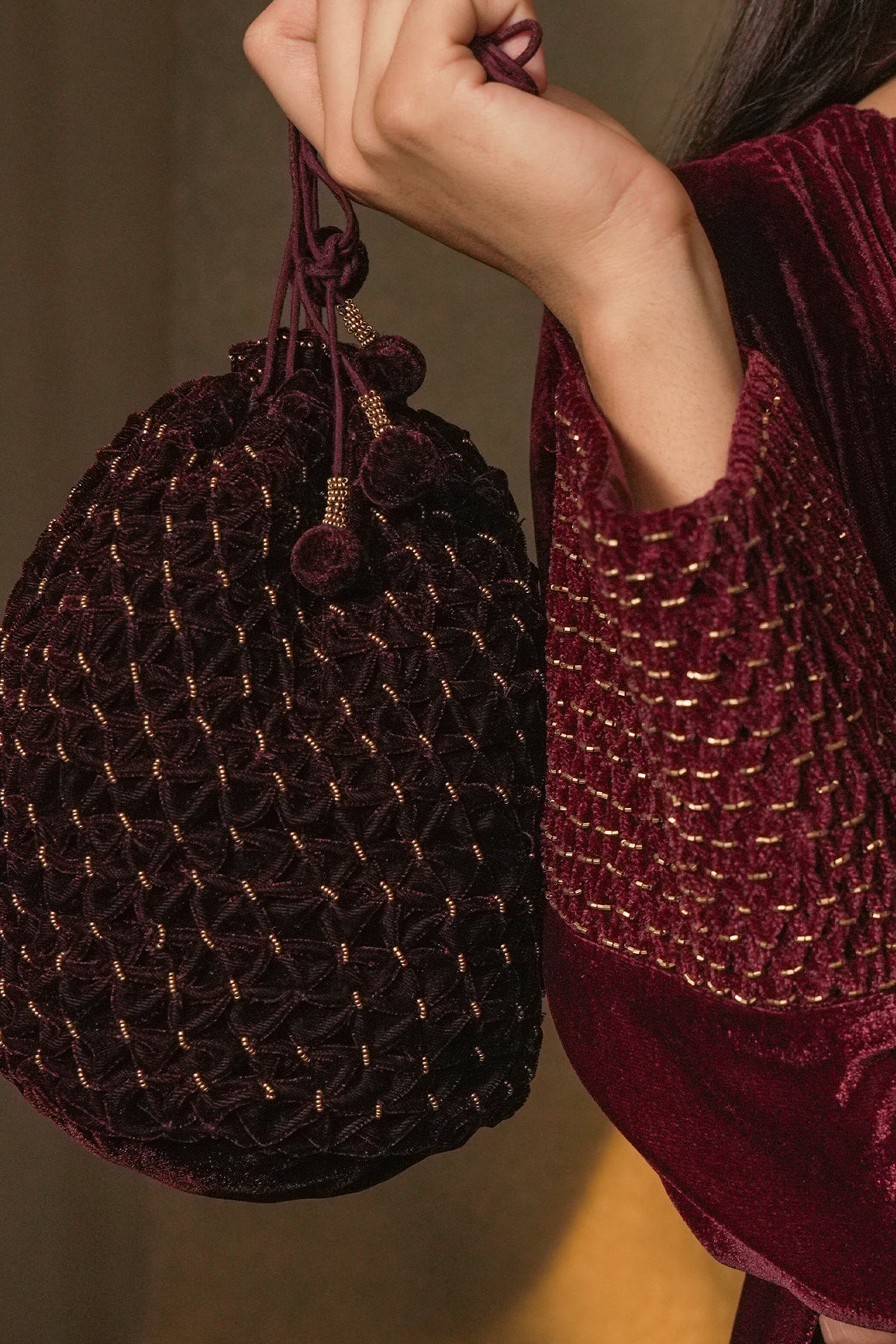 Indulge in rich elegance with the Plum Hand Embroidered Velvet Potli, crafted to elevate festive and evening ensembles. Made in plush velvet, it features intricate all-over hand embroidery, creating refined texture and depth. Finished with an adjustable knot closure, this timeless accessory blends traditional craftsmanship with a luxurious, statement finish.