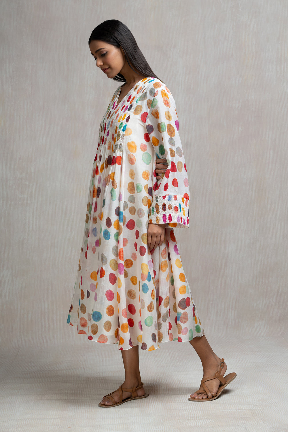 Experience the ultimate in elegance with our exquisite multicolored polka dot resort dress, crafted from the finest chanderi fabric. This luxurious summer dress offers a soft and lightweight texture, ensuring maximum comfort and breathability for warm sunny days. The vibrant polka dot print adds a playful touch, making it perfect for casual outings and sophisticated soirées alike. Embrace the charm and effortless style of this Soft Chanderi Printed Polka Summer Dress, and exude timeless grace wherever you go.